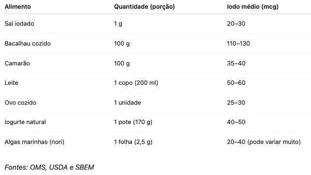 - Sal iodado – principal fonte no Brasil, recomendado em até 6 g por dia (o equivalente a 1 colher de chá).